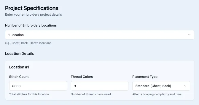 Enter the basic details for your embroidery job — including stitch count, thread colors, and placement type. The calculator automatically factors in hooping complexity and setup time for accurate cost tracking. Whether you’re working on chest logos, hats, or full backs, it adapts instantly to your project setup.
