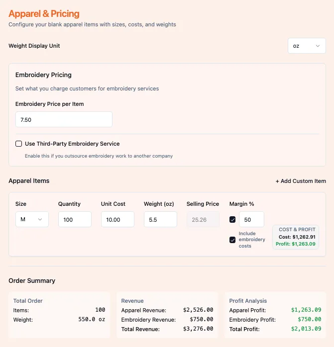 Set your embroidery price per item and enter garment details such as quantity, unit cost, and selling price. The calculator then displays your total costs, revenue, and profit margins in real time — so you can quote with confidence on every order.