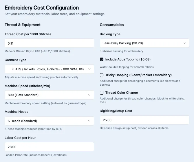 Every formula has been tested and refined using real production data from working decorators and print shops. You can even customize thread costs, labor rates, and materials to match your exact setup.