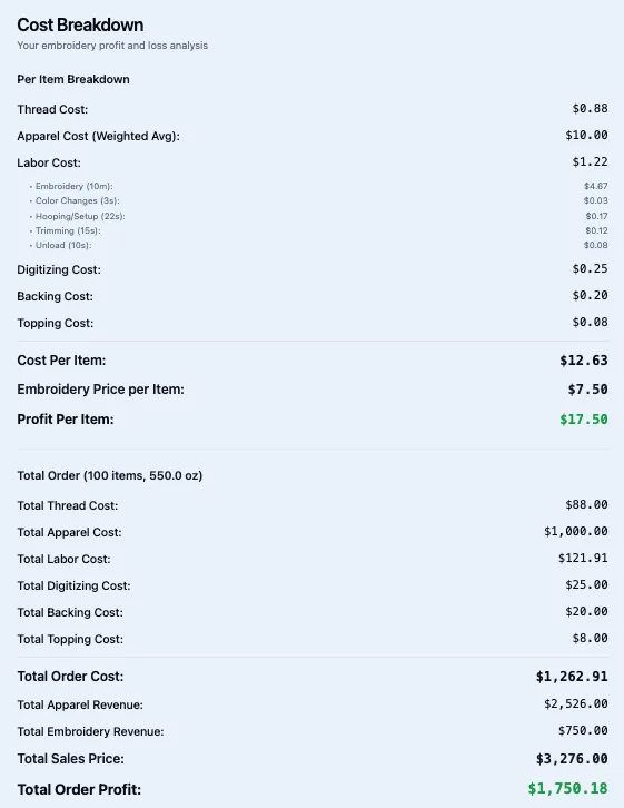 Get a complete breakdown of your embroidery costs — from thread and labor to backing and setup. Instantly see your cost per item, total order profit, and margin percentage. The calculator highlights exactly where your money is going, helping you price smarter and increase your bottom line.
