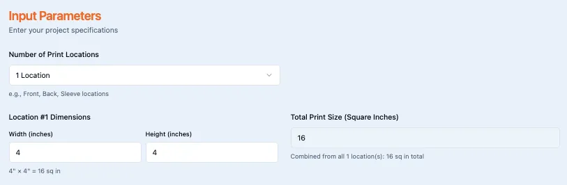 Enter the number of print locations and the size of each one. The calculator automatically measures your total print area in square inches — so every design, sleeve, or back print is priced precisely down to the inch.