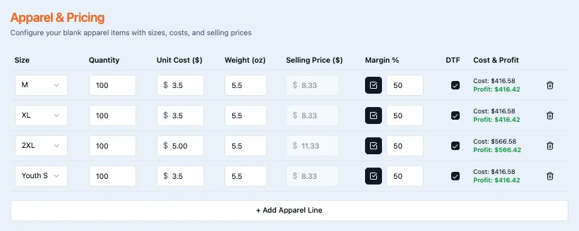 Add each apparel style, size, and cost — then set your desired profit margin. Whether you’re printing tees, hoodies, or youth sizes, the calculator instantly updates your total costs, revenue, and profit for every line item.