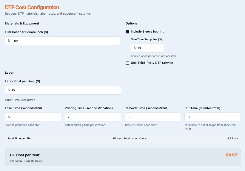 Adjust your film cost, setup fee, and labor rates to match your exact workflow. Factor in time for printing, cutting, or loading shirts — the calculator converts every second into real labor cost and total print expense automatically.