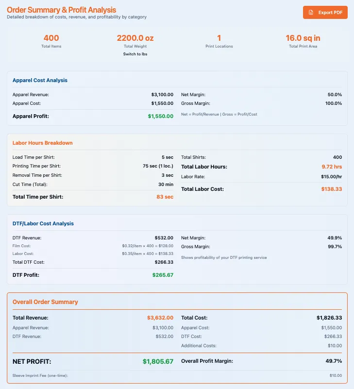 Review your entire job at a glance — from apparel costs and DTF film usage to total labor hours and net profit. The calculator shows exactly how much you’re making on every order, so you can quote confidently and maximize every print run.